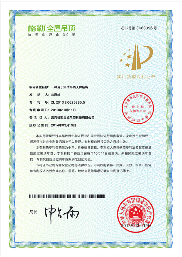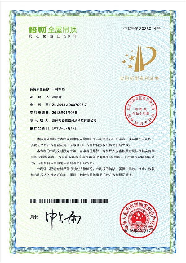 格勒作為專注于家居建材的高端品牌,累計(jì)取得專利88項(xiàng),對(duì)產(chǎn)品的創(chuàng)新和研發(fā)不斷加大投入,2019年擬成為國(guó)家高新技術(shù)企業(yè)。同時(shí)格勒先后被授予“十大公認(rèn)品牌”“十大新銳品牌”“客廳吊頂藝術(shù)大獎(jiǎng)”“十大公信力品牌”“產(chǎn)品創(chuàng)新品牌”等榮譽(yù)。格勒立志于“為每個(gè)家的健康和品味做出貢獻(xiàn)”;秉承“成就客戶、以人為本”的企業(yè)宗旨,不斷砥礪前行。