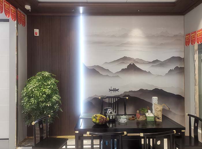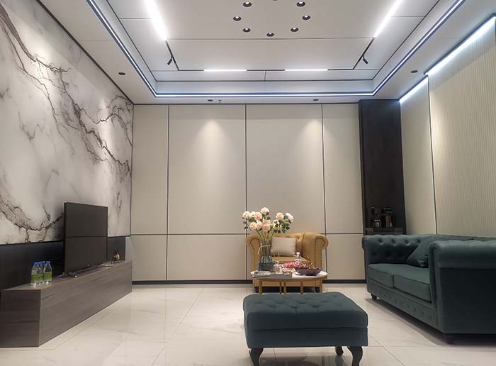 一進(jìn)入店里,干凈整潔的環(huán)境讓人感覺非常舒適。作為頂墻一體店,店內(nèi)的吊頂、墻面等裝修用的也是格勒的產(chǎn)品,可以說是“一步一景”,無需進(jìn)入樣板間,只在曲折回轉(zhuǎn)間便能見到格勒頂墻之美。