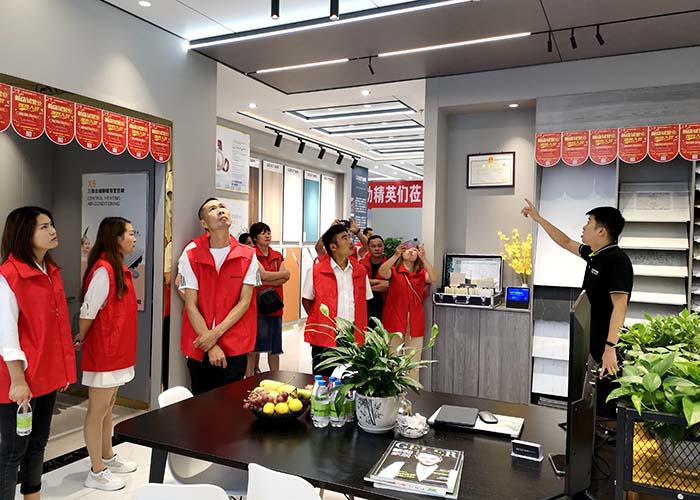 上午,在市場部富經(jīng)理的帶領(lǐng)下,各地經(jīng)銷商家人們參觀了格勒鎮(zhèn)雄專賣店。鎮(zhèn)雄店是一家頂墻一體店,也是格勒最新的SI形象店。